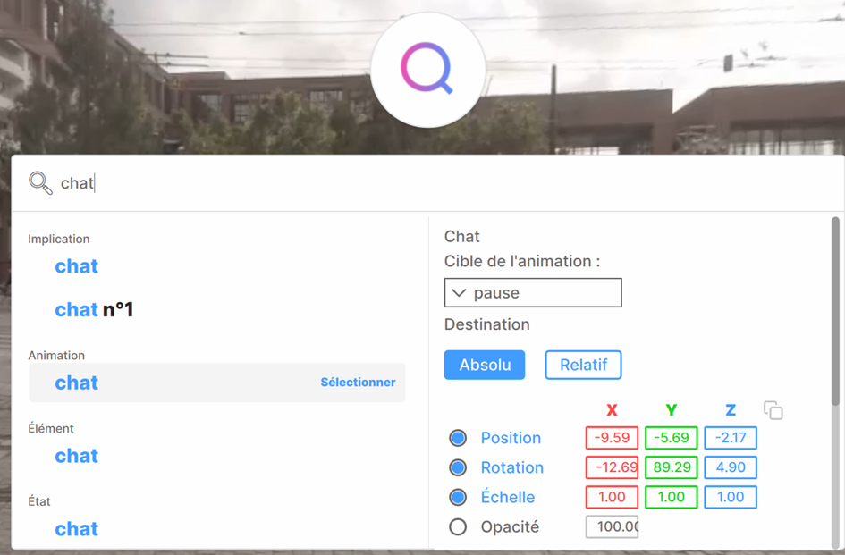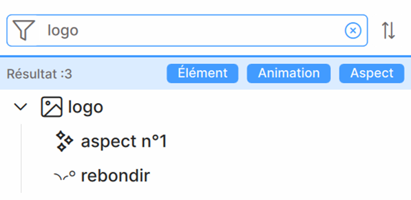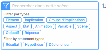 Vous pourrez donc peu importe la vue sur laquelle vous vous trouvez, rechercher parmi vos implications, vos variables et vos éléments, que cela concerne une animation, un aspect ou encore un état.