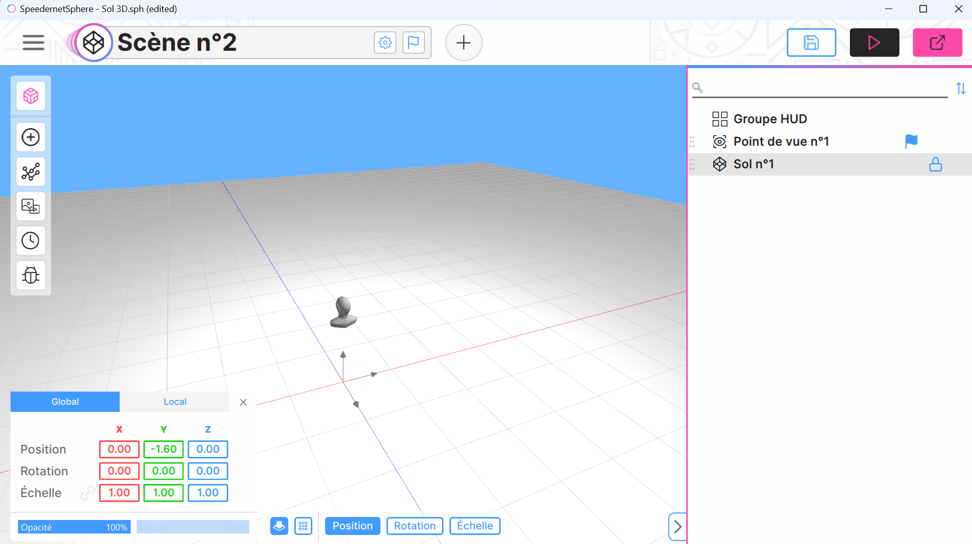 Ajoutez une scène 3D en cliquant sur le "+" dans le header (voir cet article). Un élément "Sol n°1" s'est automatiquement créé. Le sol dans une scène 3D est positionné à -1,60 mètres par défaut :